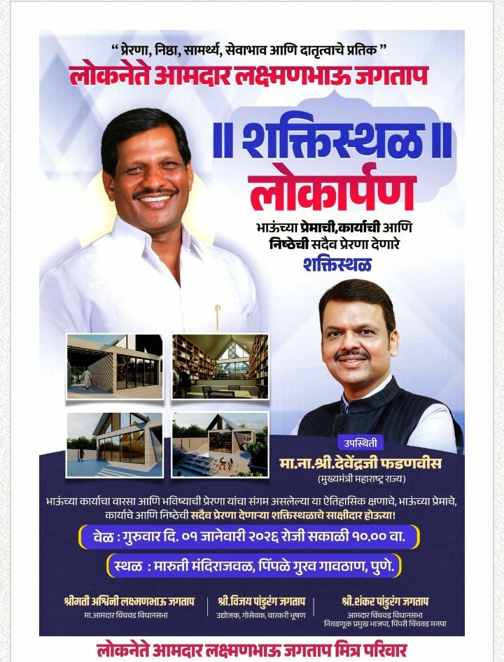 पिंपरी-चिंचवड: पिंपरी-चिंचवडच्या इतिहासात एक भावनिक व अभिमानाचा क्षण नोंदवला जाणार आहे. प्रेरणा, निष्ठा, सामर्थ्य, सेवाभाव आणि दातृत्वाचे प्रतीक असलेले लोकनेते आमदार लक्ष्मणभाऊ जगताप यांच्या स्मरणार्थ उभारण्यात आलेल्या ‘शक्तिस्थळ’ या प्रेरणा केंद्राचे भव्य लोकार्पण गुरुवार, दि. १ जानेवारी २०२६ रोजी सकाळी १० वाजता पिंपळे गुरव गावठाण येथील मारुती मंदिराजवळ होणार आहे.